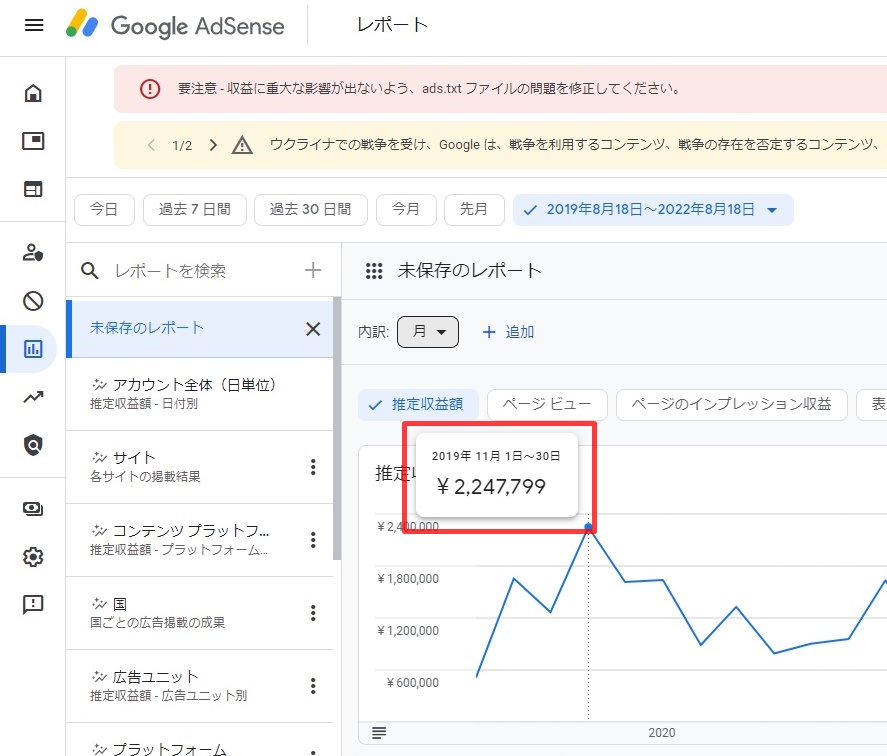 このときの月間アクセス数が500万PVを越えて、アドセンスの収益が約224万円。